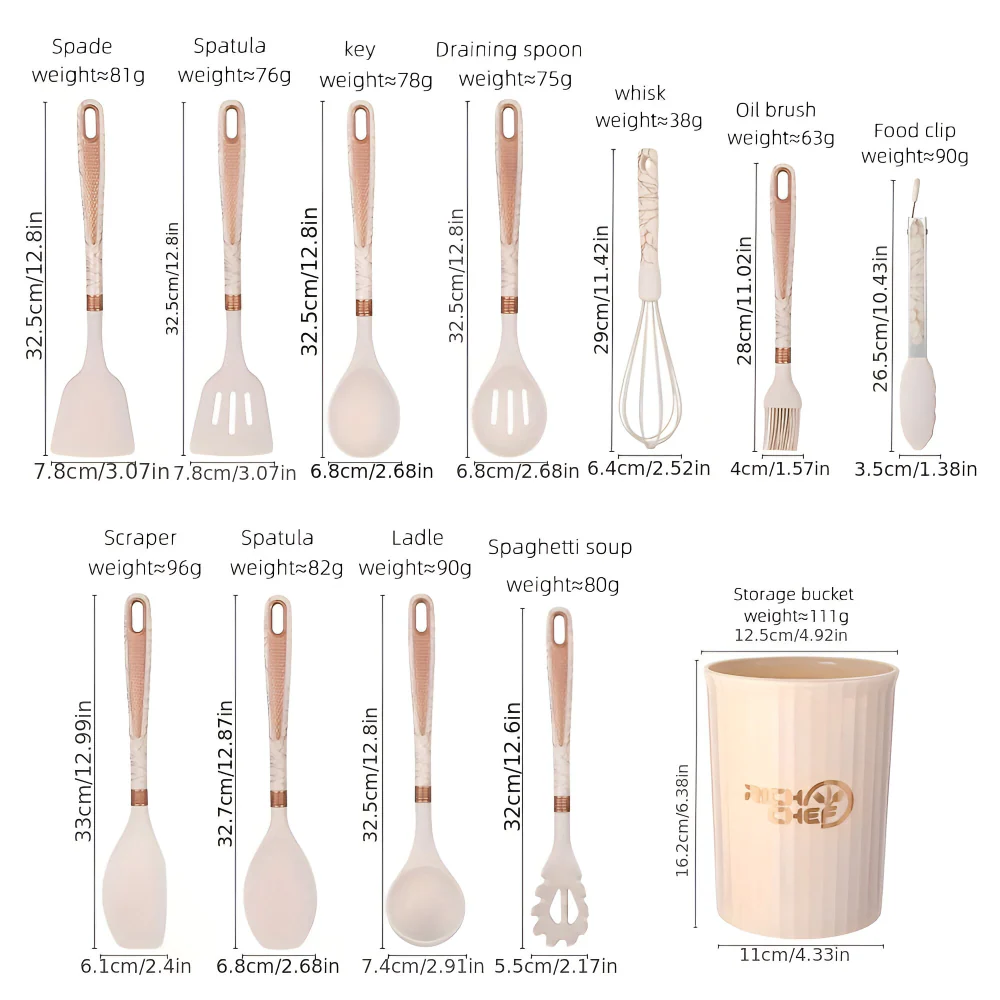 Bred spatel (7,8 x 32,5 cm), Slitsad spatel (7,8 x 32,5 cm), Sked (6,8 x 32,5 cm), Hålslev (6,8 x 32,5 cm), Vispa (6,4 x 29 cm), Oljepensel (4 cm x 28 cm), Matpincett (3,5 x 26,5 cm), Degskrapa (6,1 x 33 cm), Spatel (6,8 x 32,7 cm), Slev (7,4 x 32,5 cm), Pastaslev (5,5 x 32 cm), Förvaringsbehållare (11 x 16,2 cm)