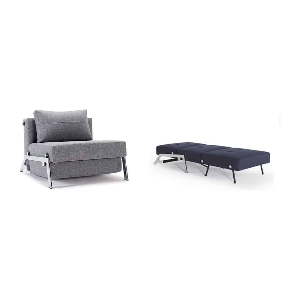 Cubed 90 Chrome en riktigt smidig bäddfåtölj där benen fälls ut automatiskt när du fäller ut soffan. Det finns plats för förvaring i soffan. Soffan finns i fyra standardtyger.