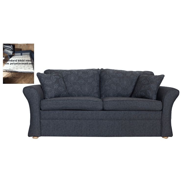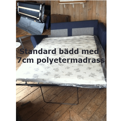 Sängen i bäddsoffan är en ribbotten med en polyestermadrass, du kan även uppgradera din bäddsoffa med en resår madrass. Bäddsoffan levereras monterad så när som på benen.