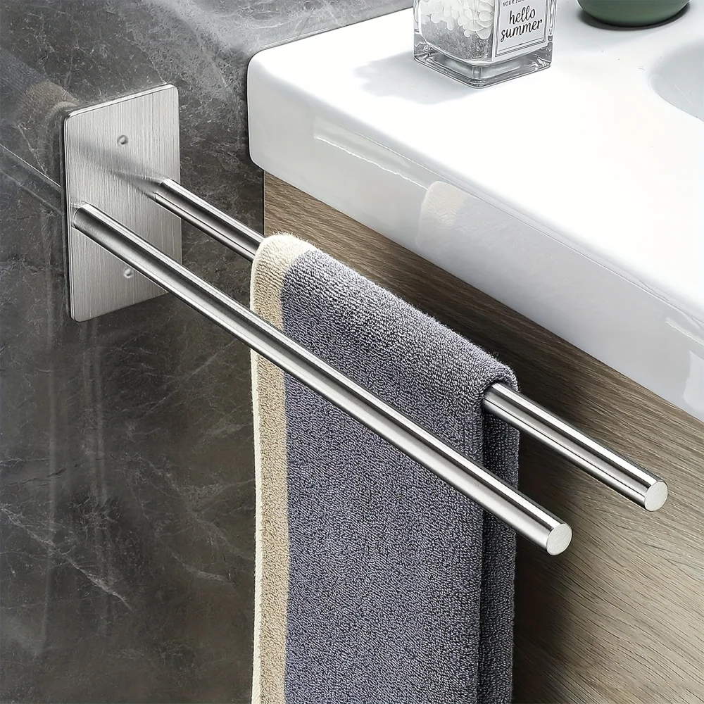 Försköna ditt badrum med denna eleganta dubbla handdukshållare som förenar funktionalitet och stil. Tillverkad av högkvalitativt rostfritt stål, garanterar den hållbarhet och rostbeständighet, även i fuktiga miljöer. Perfekt för kök, badrum och hotell, ger den ditt rum en touch av elegans samtidigt som den håller dina handdukar organiserade och lättillgängliga.